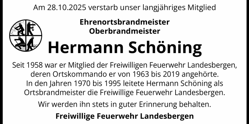 Am 28. Oktober 2025 ist unser Ehrenortsbrandmeister Hermann Schöning verstorben. Sein Tod erfüllt uns mit großer Trauer, zugleich aber auch mit tiefer Dankbarkeit für sein außergewöhnliches Engagement und seine jahrzehntelange Verbundenheit mit unserer Feuerwehr.