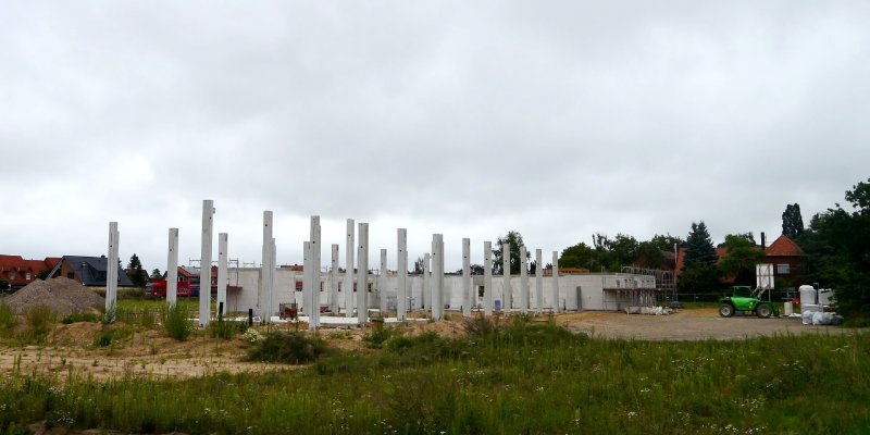 Auf der Baustelle am Vagesweg finden deutlich sichtbare Aktivitäten statt. Im Wochenverlauf wurden die Betonständer für die Fahrzeughalle aufgestellt. Die Montage weiterer Fertigbetonelemente erfolgt zeitnah, so dass auch der Beginn von Zimmer- und Dachdeckerarbeiten absehbar ist.