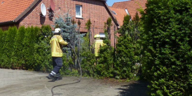 Bei Gartenarbeiten hatte sich eine Hecke spontan entzündet und drohte auf das Nachbarhaus überzugreifen. Ein Feuerwehrkamerad aus der Nachbarschaft konnte den Brand in der Entstehung mit einem Feuerlöscher löschen, sodass die Feuerwehr Landesbergen lediglich 500 Liter zu Nachlöscharbeiten einsetzen musste.